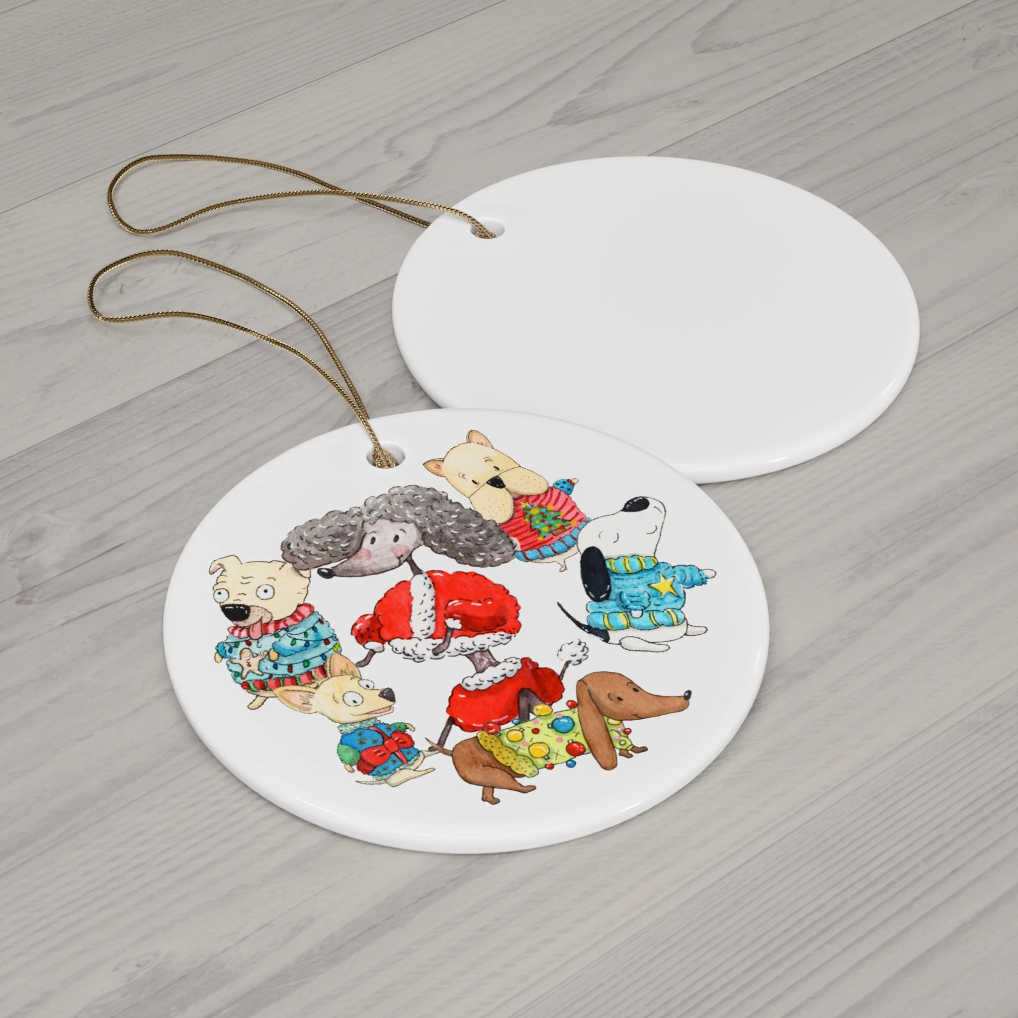 Ugly Sweater Party ornament: Dogs proudly showing off their hilariously ugly Christmas sweaters — Design your own set of Christmas decorations to make your tree hip, traditional, or funky to suit your unique style. These custom-made Christmas ornaments can be the perfect heirloom to use year after year, generation after generation. The ceramic ornament in circle.