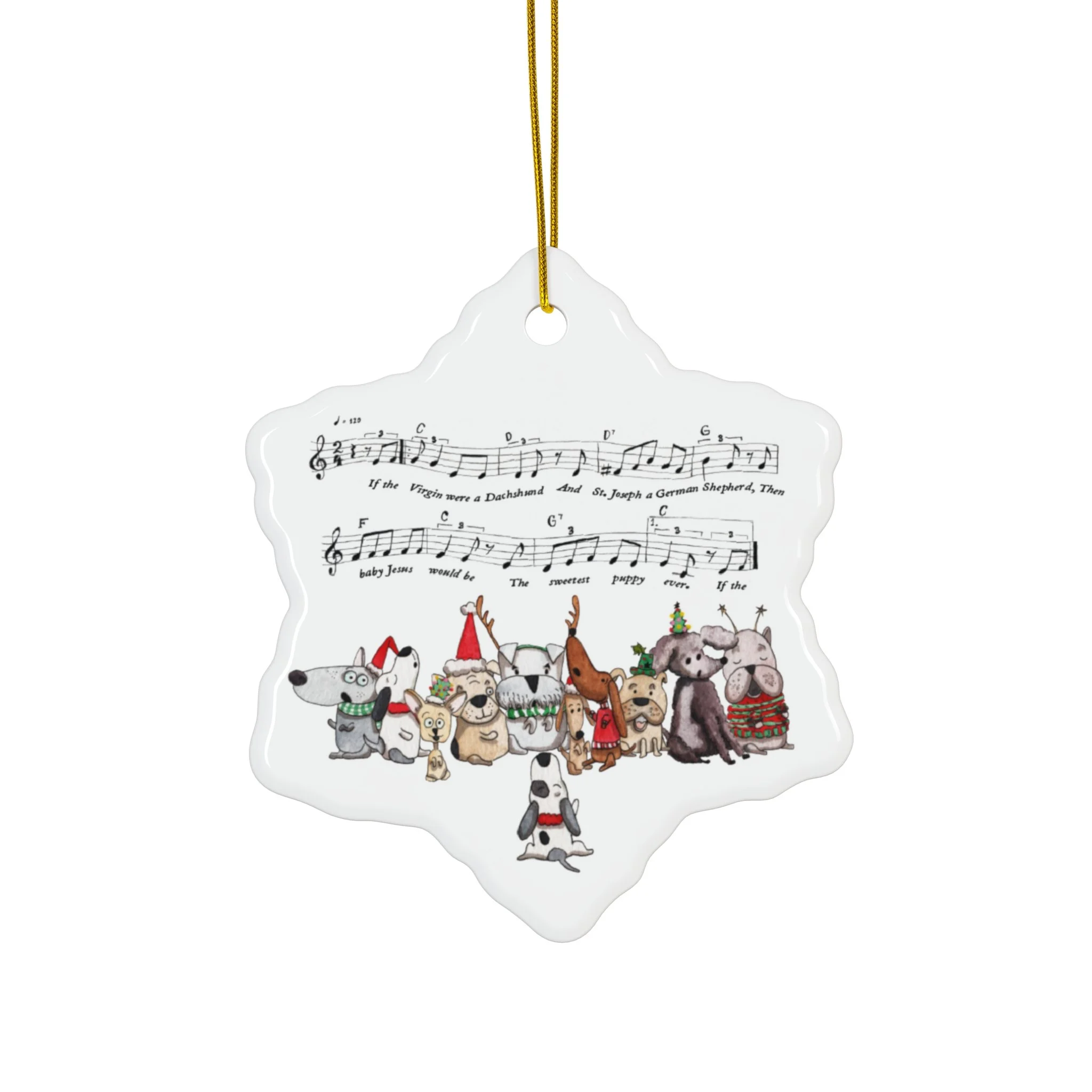 Dog Christmas Carols snowflake ornament: A joyful group of dogs singing together, celebrating Christmas with music, friendship, and wagging tails. Design your own set of Christmas decorations to make your tree hip, traditional, or funky to suit your unique style. These custom-made Christmas ornaments can be the perfect heirloom to use year after year, generation after generation.