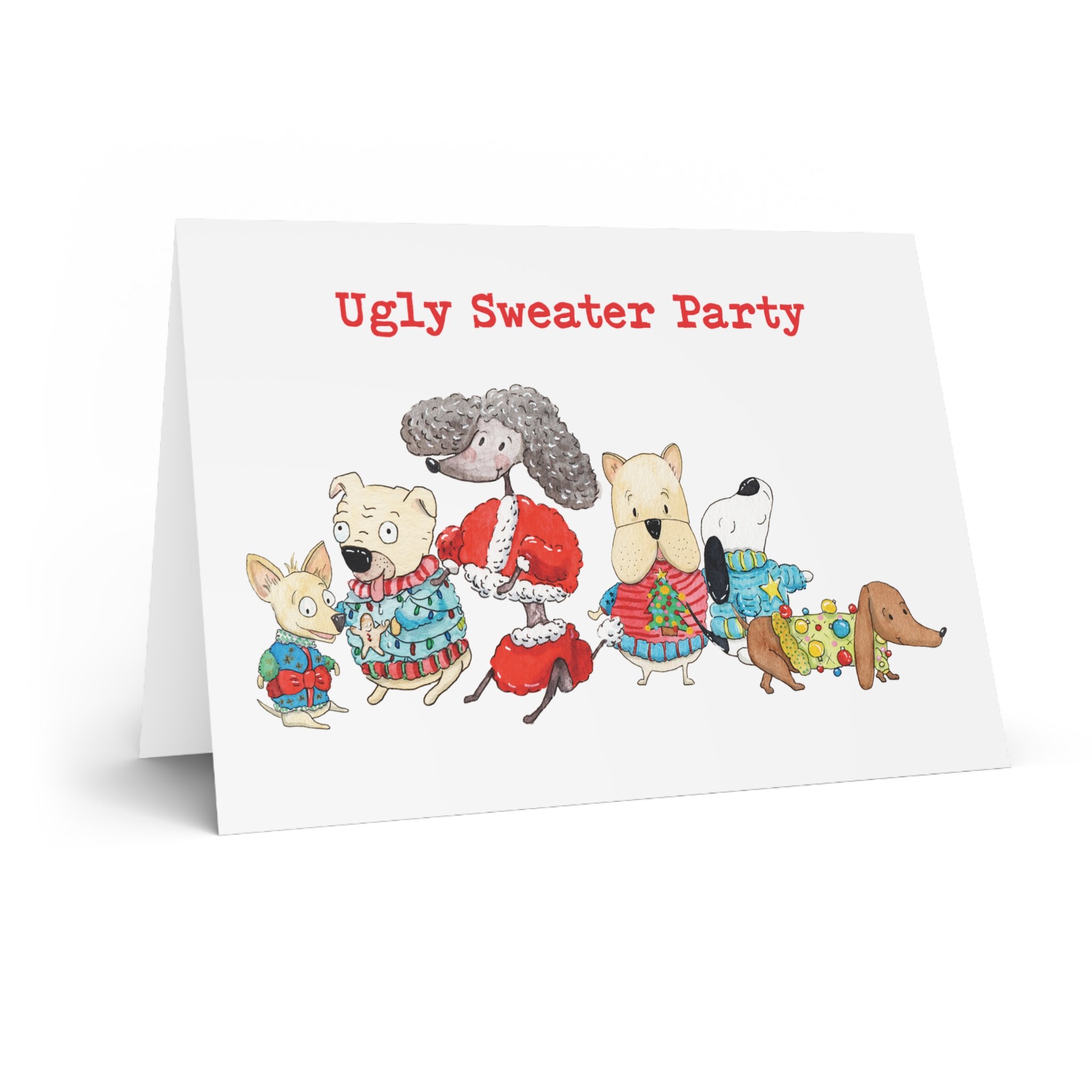 Get ready for a pawsome Christmas party! 🎉 This fun holiday card features a car full of dogs proudly showing off their hilariously ugly Christmas sweaters — each one sillier than the last! Inside message: “Who is the ugliest of them all?” A perfect card for dog lovers, friends, and anyone who enjoys a good laugh during the holidays.